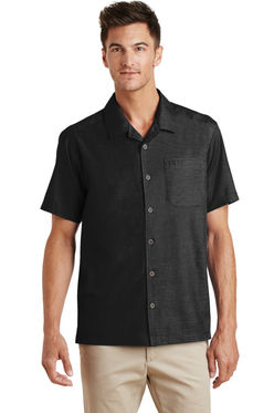 Lightweight and breathable this modern take on the conventional camp shirt is designed for restaurants resorts spas and more. With a subtle dobby texture this streamlined style becomes softer wash after wash. Plus it performs by releasing stains and maintaining a wrinkle-free appearance that lasts long beyond your shift. 3.2-ounce 60/40 cotton/poly yarn-dyed dobby Camp style collar Faux horn buttons Left chest pocket with bias detail Turned-up sleeve cuff hems Side vents